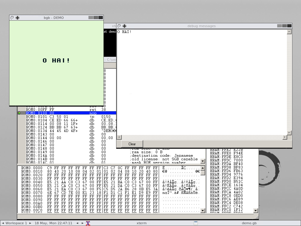 Yeh, I use BGB. I guess my question is "how do I actually do this in GBDK?" Like I'm fine with inlining ASM, if it supports it, I'm just not sure how to actually do it. I am pretty new to GB dev, and have a game-rom that does funny stuff with the memory using custom hardware cart, so I emulate that the RAM has a list of games in it. I tried a few ASM-in-GBDK snippets of demo-code, but couldn't get it to actually work. My ROM/hardware is working pretty well, so I'd really prefer to ignore the overwhelming (but I'm sure well-intentioned) advice to "rewrite it in ASM", which seems so prevalent in the GB programming scene. If I could add debugging when I'm working on the ROM in BGB, that'd be great, though. gbdkjs handles this by adding some webasm functions that allow debugging, so if I can't get it to work in regular ROMs, I might have to just switch to using that, even though BGB has a much nicer emulator. As a sidenote, if you want to have my exact GB dev setup, I assembled it all as a docker container here. Basically, I'm using gbdk-n.