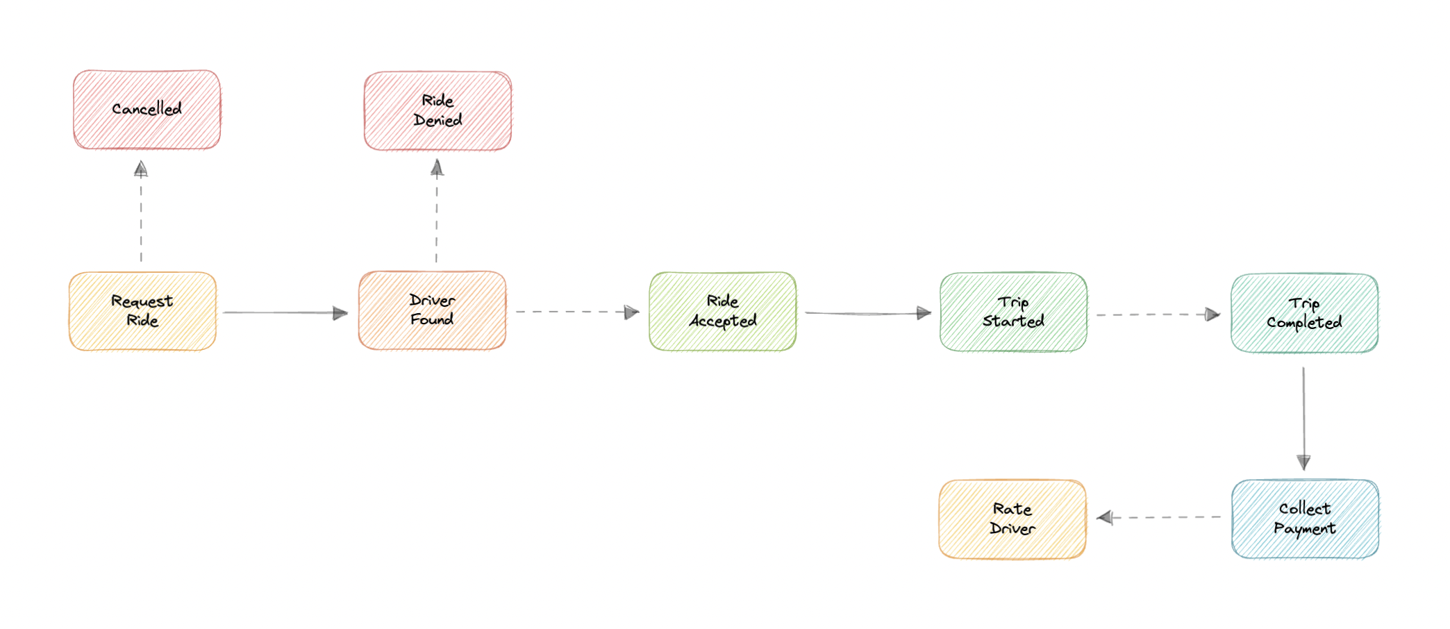 - Customer requests a ride by specifying the source, destination, cab type, payment method, etc.