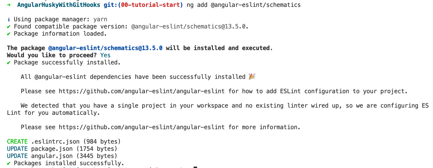 ng add @angular-eslint/schematicsEsto servirá para que automáticamente instale las dependencias necesarias y a su vez realice las configuraciones necesarias como añadir en angular.json el registro de los diferentes Schematics usados en la propiedad "schematicCollections" entre otros ajustes.