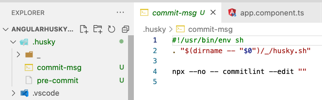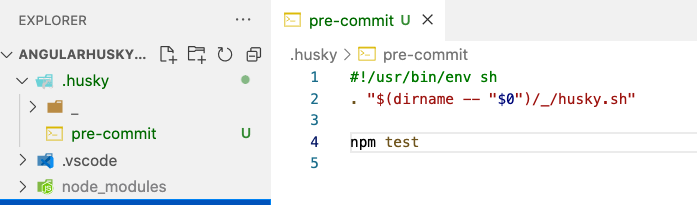 Con esto se añadirá un directorio en la raíz llamado .husky que contiene un fichero para ejecutar los hooks de Git llamado pre-commit con el comando para ejecutar el test de Angular con npm test