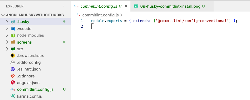 echo "module.exports = { extends: ['@commitlint/config-conventional'] };" > commitlint.config.jsAl ejecutar el comando, en la raíz del proyecto veremos un nuevo fichero commitlint.config.js.