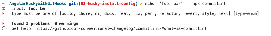 ¿Cuál es el motivo de que nos de un error? Como bien nos indica el feedback del error, el tipo debe de ser uno de los especificados en el mensaje "type must be one of [build, chore,..." y como se puede observar, el type está especificado con "foo".