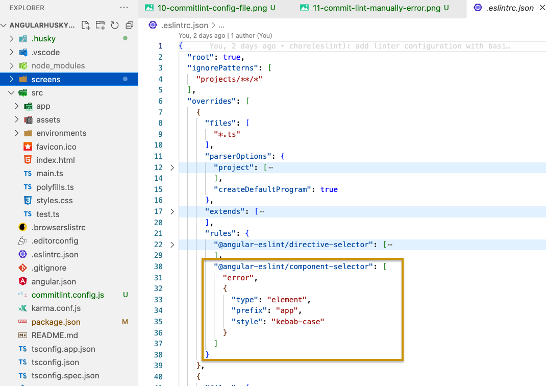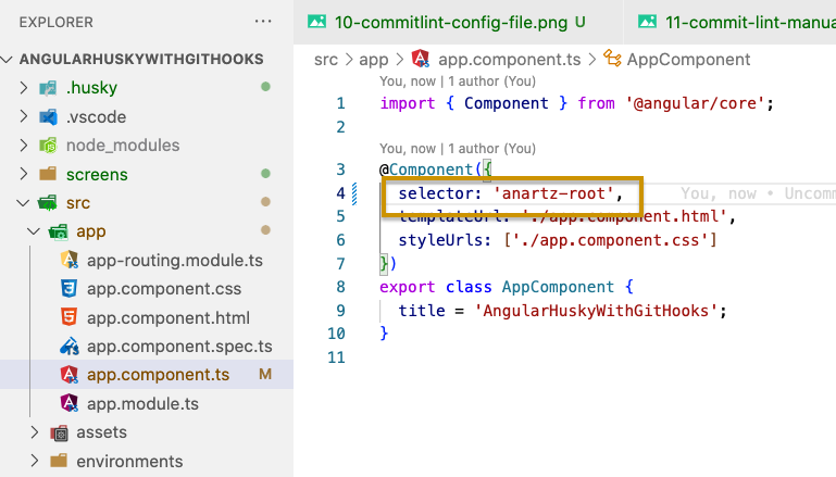 git commit -m "feat: mensaje de prueba"si da un ejemplo como el siguiente (voy a modificar un fichero para forzar el error cambiando el prefijo de la aplicación principal por anartz teniendo que ser app ya que está establecido en las reglas en el fichero .eslintrc.json