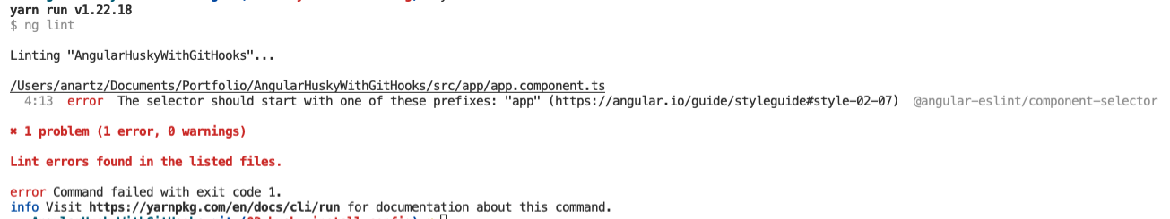 Haciendo el cambio en el selector de app-root a anartz-root forzaremos el error al ejecutar yarn lint
