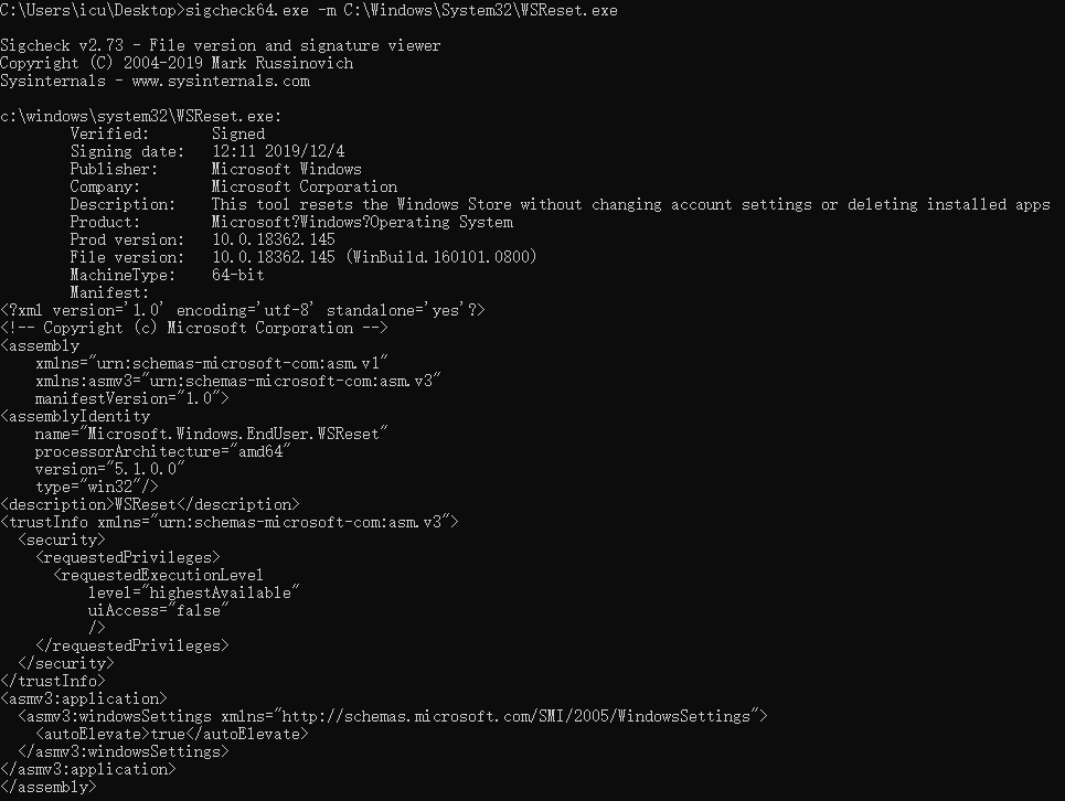 利用微软提供的sigcheck.exe签名检查工具发现 C:\Windows\System32\WSReset.exe 存在autoElevate属性为true