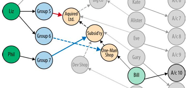 RETURN pathsAs a result of her membership of Group 4 and its ALLOWED_INHERIT permission on Big Co, Liz can manage Big Co. But despite this being an inheritable relationship, Liz cannot manage Acquired Ltd or Subsidiary. Group 5, of which Liz is a member, is DENIED access to Acquired Ltd and its children (which includes Subsidiary).