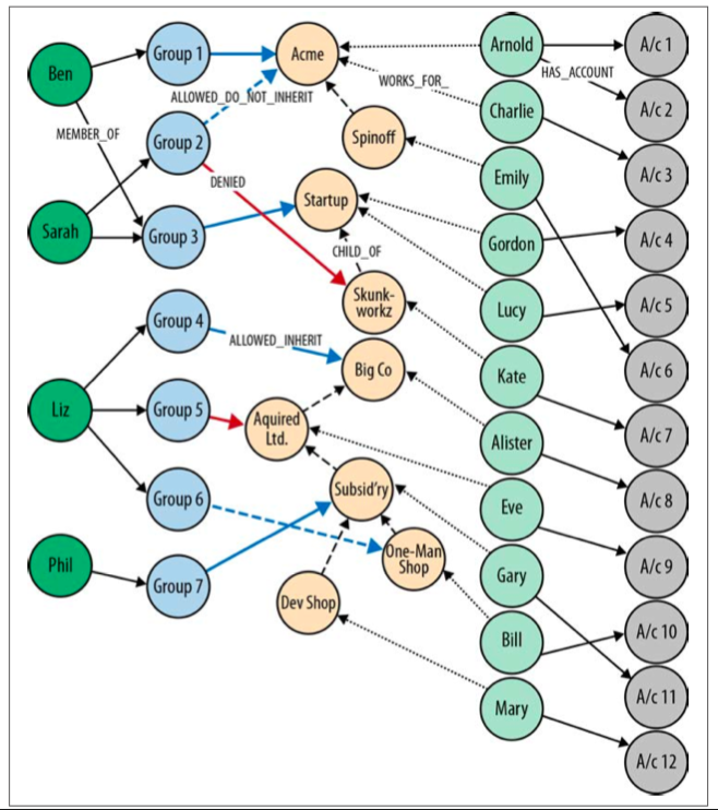 LIMIT 50Although not extremely complex, this GraphGist has a lot of interconnected parts. Let’s progress from simple to complex queries as we explore the different types of access control individually.