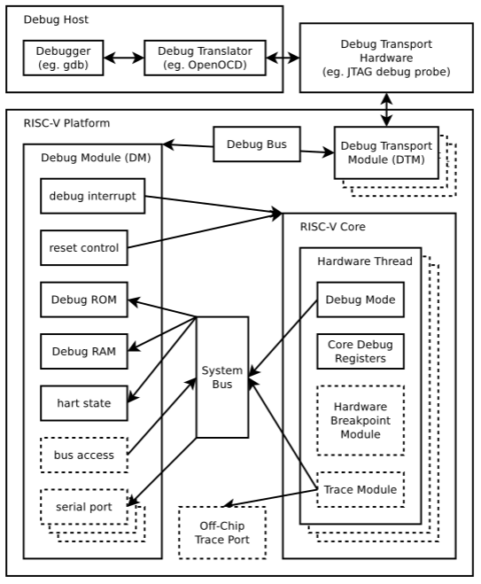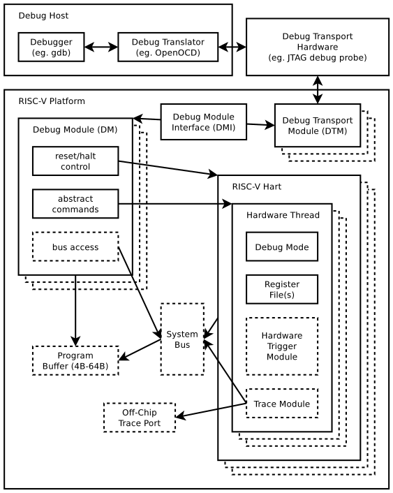 This gist discusses implementation of a Debug Module (DM) primarily per RISC-V Debug Specification v0.11. The core ideas, though, apply to Debug Specification v0.13. Information presented here come from various sources, but mostly from Debug Specs, riscv-isa-sim and from reverse engineering e200_opensource. Relevant source of information is also riscv-openocd.