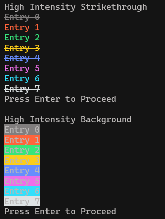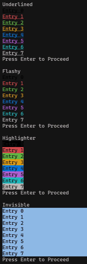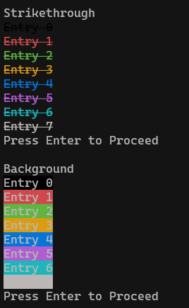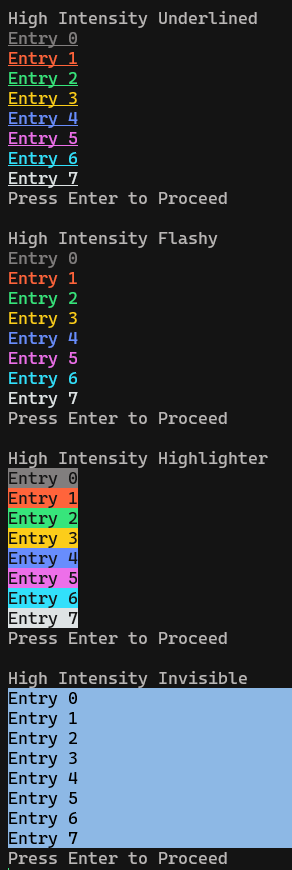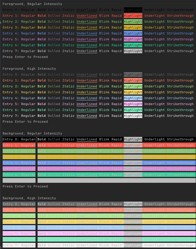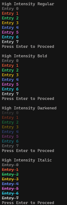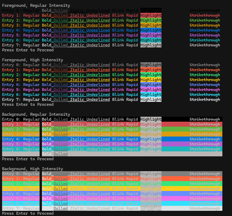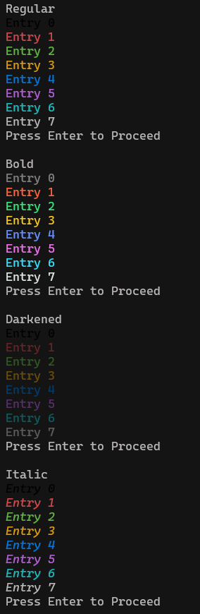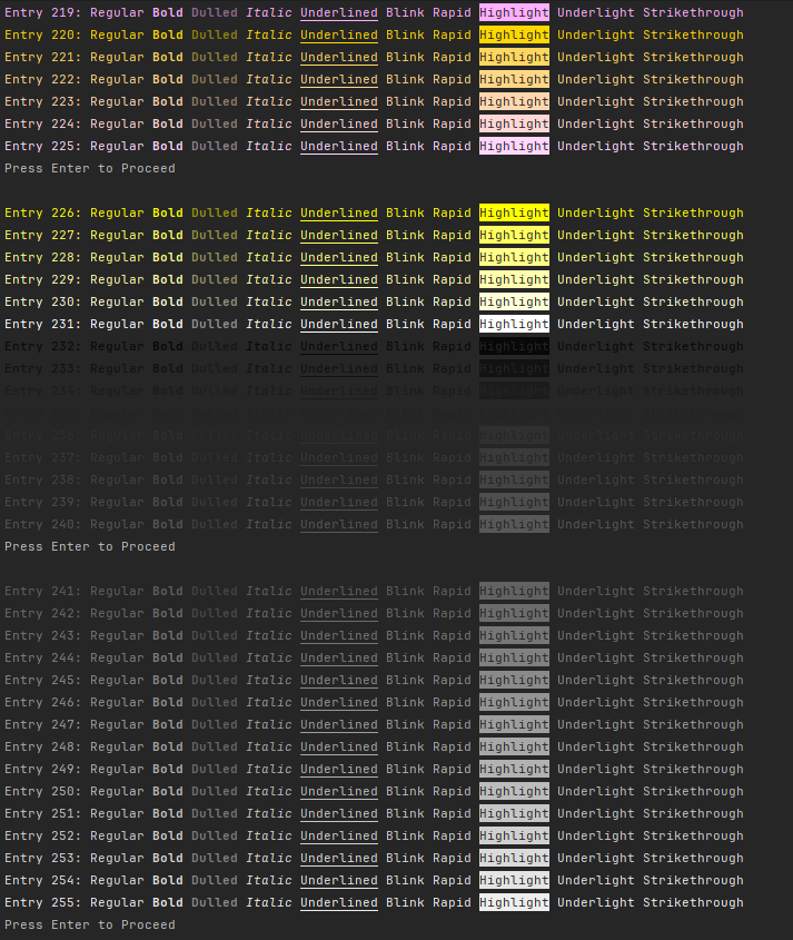\x1b[1;31m # Set style to bold, red foreground.ESC- sequence starting withESC(\x1B)CSI- Control Sequence Introducer: sequence starting withESC [or CSI (\x9B)DCS- Device Control String: sequence starting withESC Por DCS (\x90)OSC- Operating System Command: sequence starting withESC ]or OSC (\x9D)