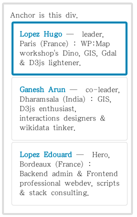 | "introduction": "GIS, D3js enthusiast, interactions designers & wikidata tinker", | |