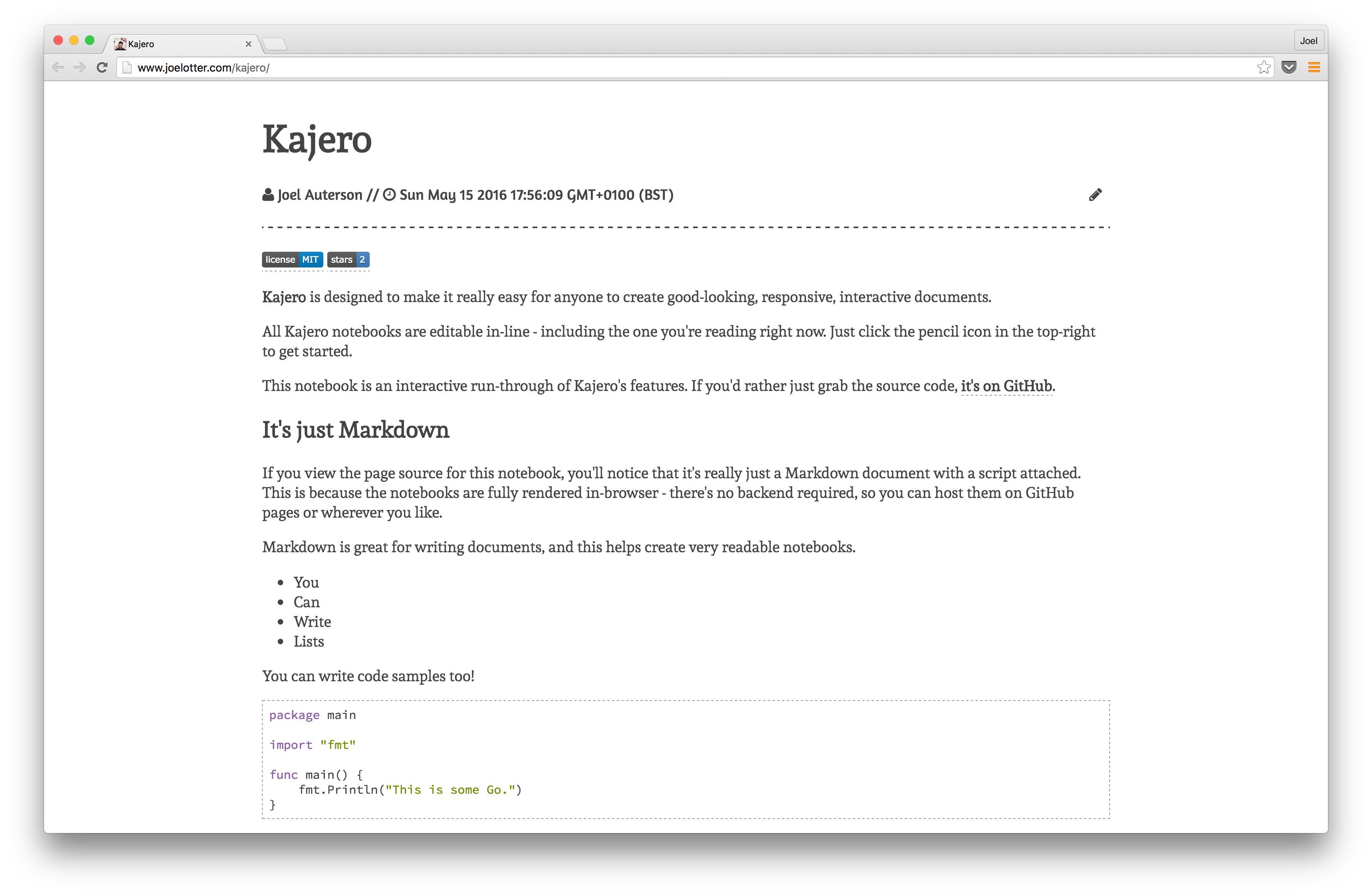 title: "Javascript Notebook" author: "Wes Sonnenreich" created: "Sun Dec 18 2016 23:22:51 GMT+1100 (AEDT)" datasources: joelotter: "https://api.github.com/users/joelotter/repos" popular: "https://api.github.com/search/repositories?q=created:>2016-01-01&sort=stars&order=desc" original: title: "Kajero" url: "http://localhost:3000/"