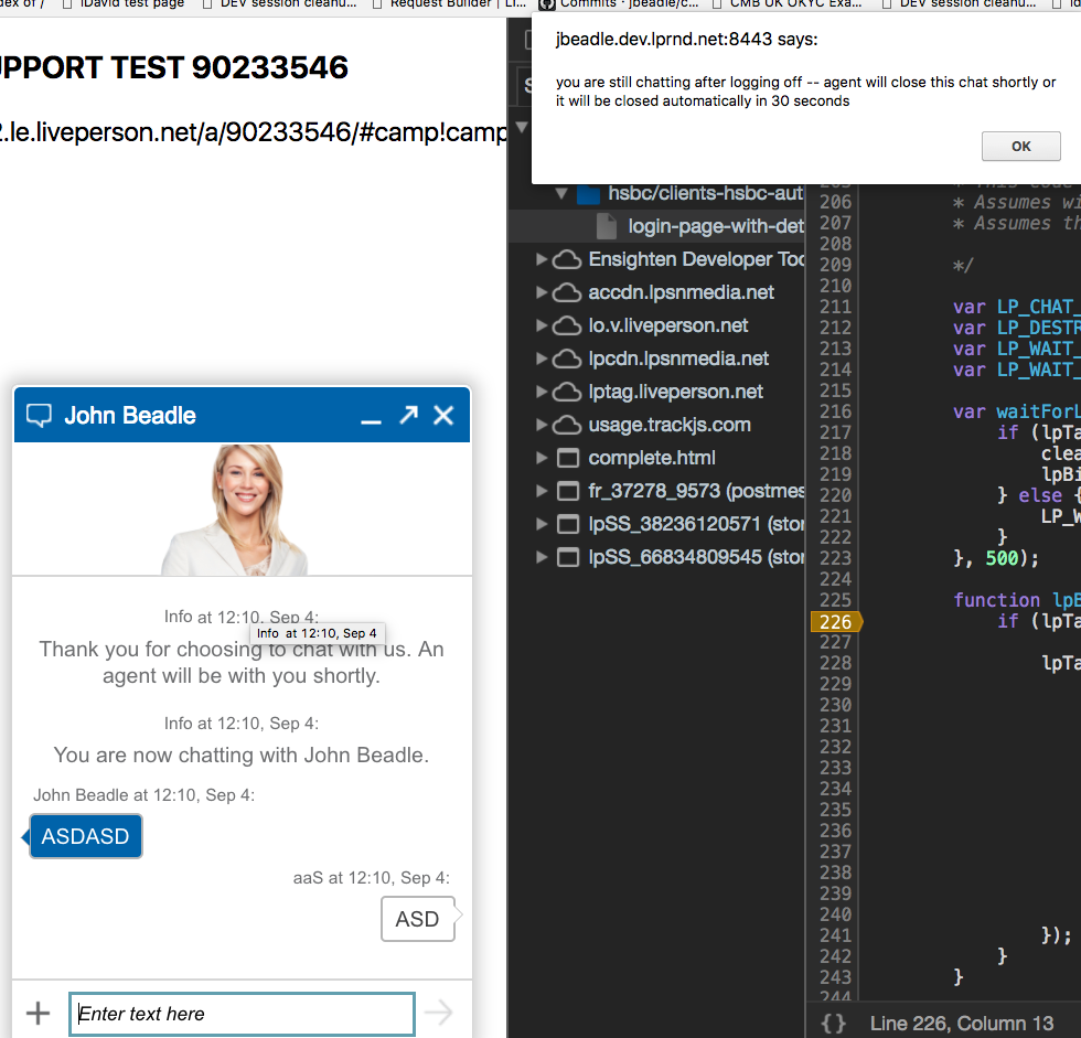 | alert("you are still chatting after logging off -- agent will close this chat shortly or it will be closed automatically in 30 seconds"); | |