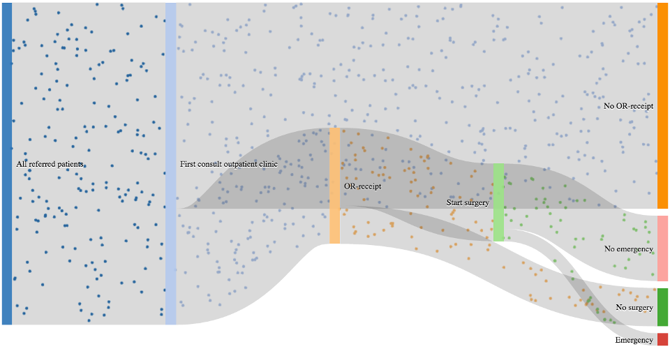 a Sankey Particles visualization of patient flow through an orthopaedic clinic