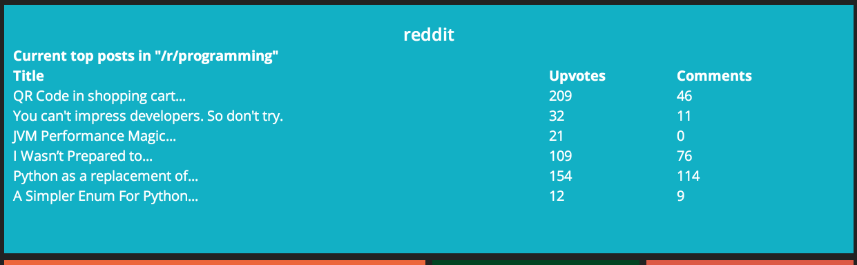 Took a little inspiration from the News widget to construct this Reddit widget. Simply add the subreddit .json feed URLs that you want to the top of the reddit.rb job script, and the widget will cycle through each one, showing top posts, their score, and comment count. You can also set the maxcount higher or lower, the default is 5 posts.