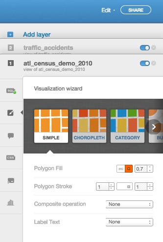 THe Style Wizard allows you to easily tap into CartoDB's Map design language CartoCSS.