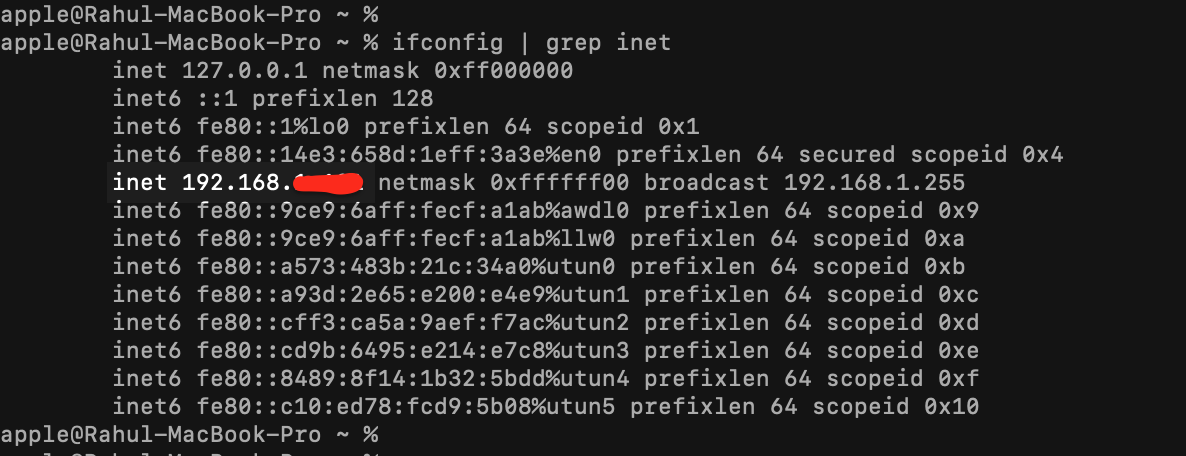 | mac and linux => terminal => ifconfig | grep inet => inet adderss | |