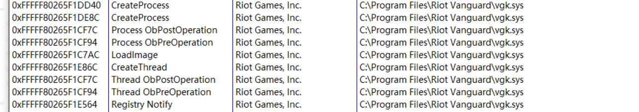 ntoskrnl.KiClearLastBranchRecordStack.g_LbrClearStackgets the execution time atSwapContext, replacing the real-page table with correct game data with the game white list range - VGK drives the registration of callback functions such as the process, thread, object, mirror loading, registration form, power state, shutdown, etc. completed within the