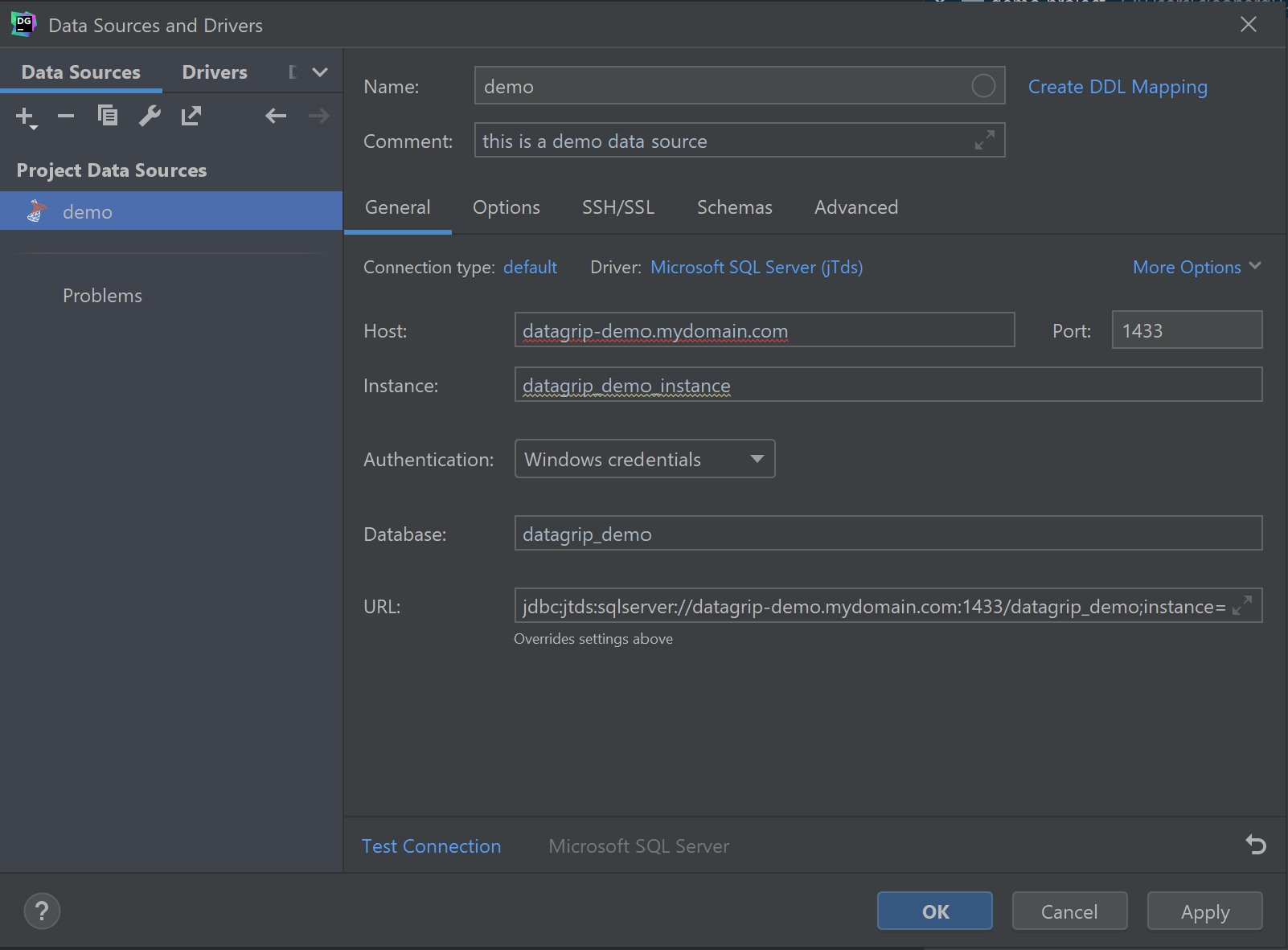 If you have never used the Microsoft SQL Server (jTds) driver in DataGrip before, look for a link near the bottom of the screen offering to download it for you. Click it and it will be installed for you quickly and automatically.