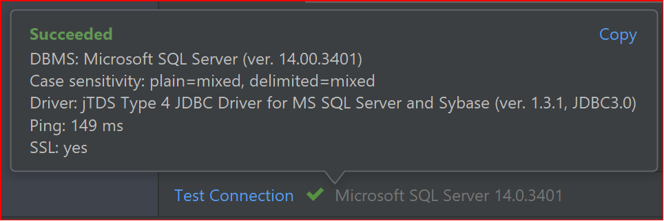 Switch back to the General section and click the Test Connection link. If all goes well, you should get a success message, and should be able to begin to query this data source. Congratulations, you've just connected to SQL Server using Windows Authentication in a way that works from Windows, macos, and Linux!