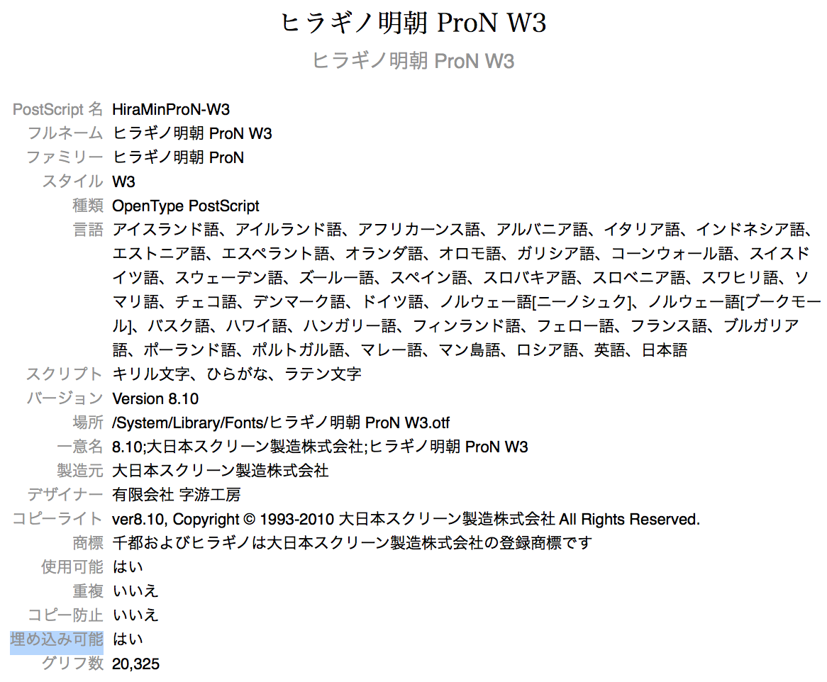実際に /Applications/Font Book.app を実行してヒラギノフォントのフォント情報を表示すると
